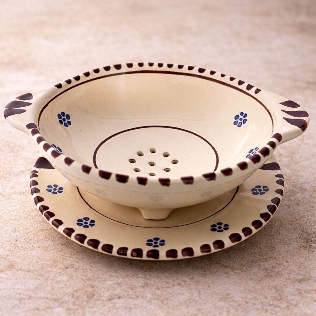 Contenitori traforati per scolare latticini sono diffusi in diverse aree dell’Italia meridionale, dove la produzione di formaggi freschi richiede strumenti semplici ma funzionali. In Puglia questi oggetti sono stati spesso realizzati in terracotta o ceramica smaltata, materiali tradizionali dell’artigianato regionale. Con il tempo la forma si è stabilizzata in piccole ciotole forate adatte alla tavola domestica. Nelle cucine contadine e nelle masserie servivano a mantenere i formaggi asciutti e pronti per essere consumati poco dopo l’acquisto.