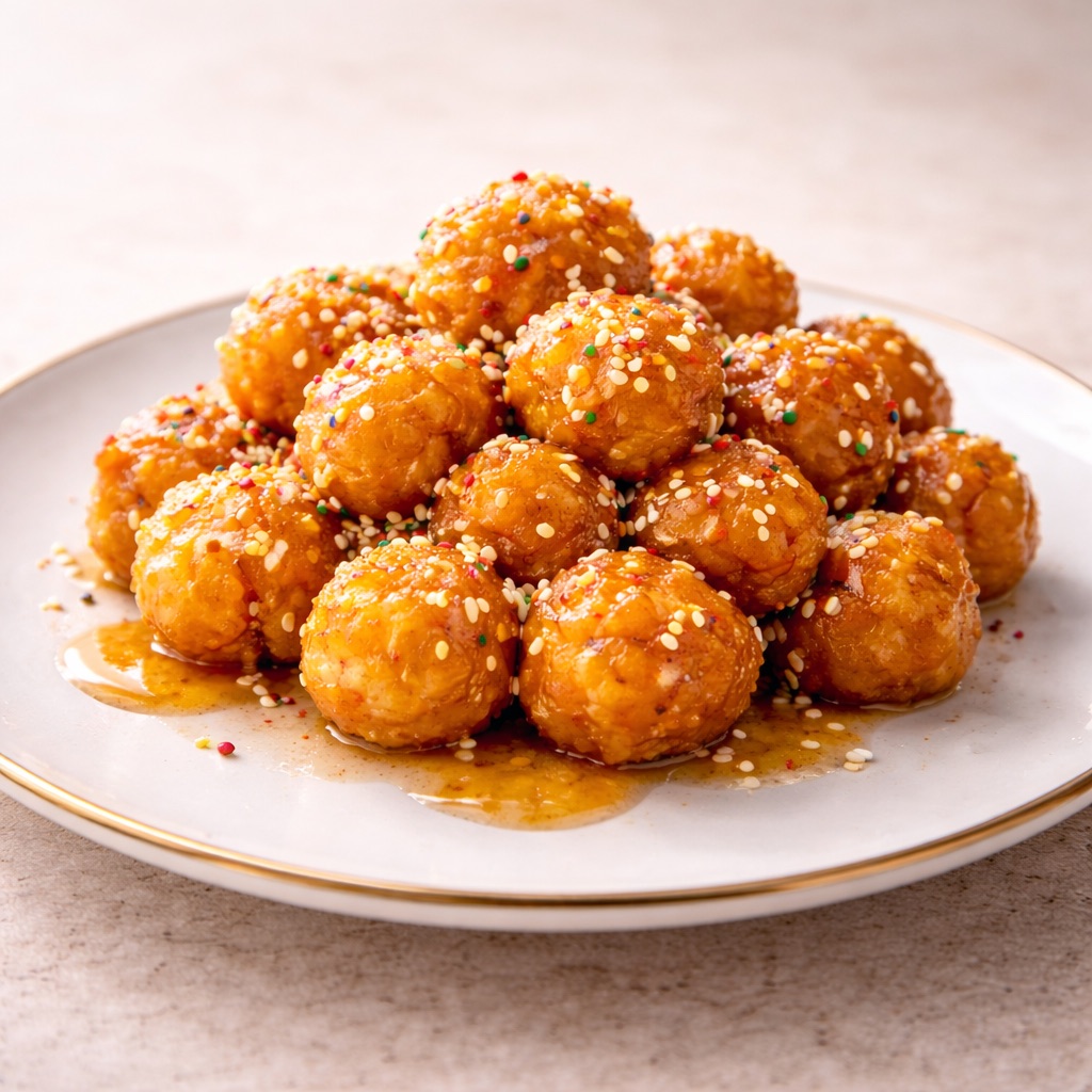 I purceddhruzzi sono piccoli gnocchetti di pasta dolce fritta, ricoperti di miele caldo e spesso decorati con confettini colorati. La loro superficie è leggermente croccante mentre l’interno rimane morbido e profumato di agrumi o liquore, a seconda della ricetta familiare. Vengono generalmente disposti a mucchietto o a corona su un piatto da portata. A Lecce e nel Salento compaiono soprattutto durante il periodo natalizio, quando riempiono vassoi e tavole domestiche.